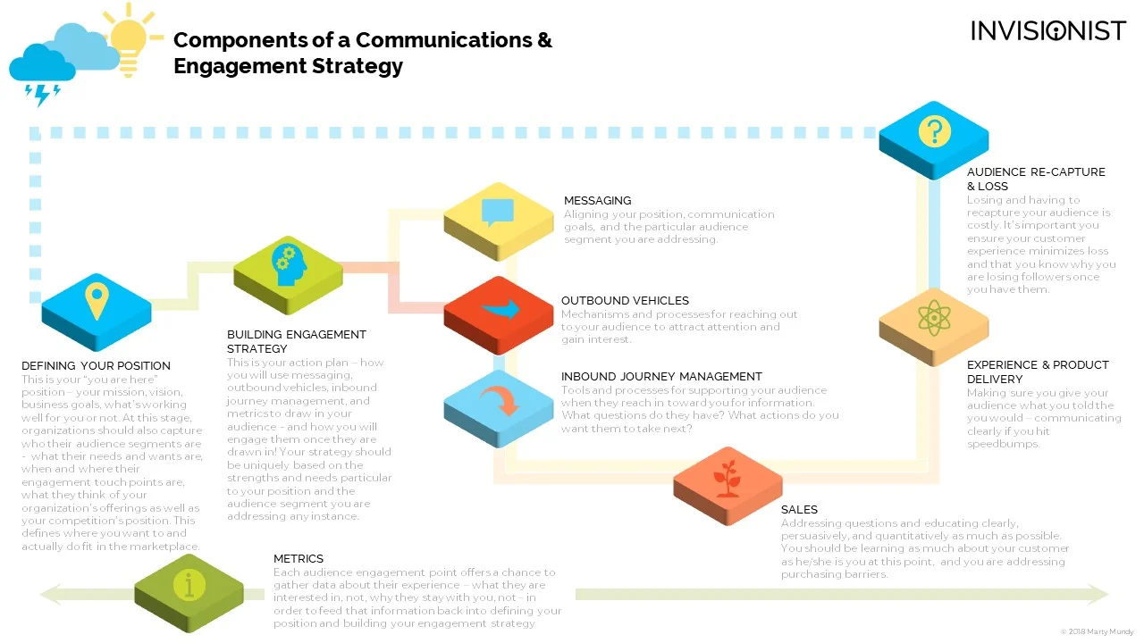 Diagram developed to show what the components of a marketing and communications strategy include and how those components are related.